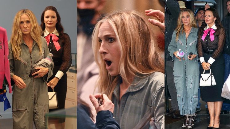 Sarah Jessica Parker STRASZY w szarym kombinezonie i z drogocennym GOŁĘBIEM pod pachą na planie serialu "I tak po prostu" (ZDJĘCIA)