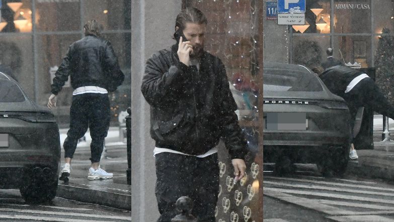 Na zdjęciach możemy zauważyć, że poszedł załatwić kilka spraw na mieście, jednocześnie rozmawiając przez telefon.