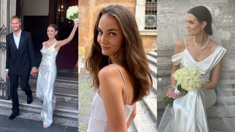 Julia Bijoch i jej ukochany zdecydowali się zorganizować ceremonię zaślubin poza granicami Polski - para wymieniła przysięgi wierności w malowniczym Rzymie. Siostra słynnej modelki poślubiła wybranka w minimalistycznej, satynowej kreacji na ramiączkach w kolorze złamanej bieli. Stylizację na wielki dzień panna młoda dopełniła prostym kokiem oraz elegancką biżuterią - złotymi kolczykami i perłowym naszyjnikiem.