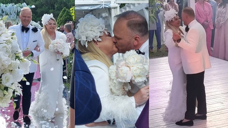 Panna młoda zaprezentowała się w kreacji Violi Piekut, a motywem przewodnim były kwiaty i pióra. Pan młody z kolei wystąpił w białej marynarce, którą zestawił z kontrastującą czarną muchą i ciemnymi spodniami. Zakochani pobrali się w pięknych okolicznościach przyrody - nie zabrakło kwiatów i zieleni. Wśród gości paparazzi dostrzegli między innymi Katarzynę Warnke, która miała na sobie niebieski garnitur.