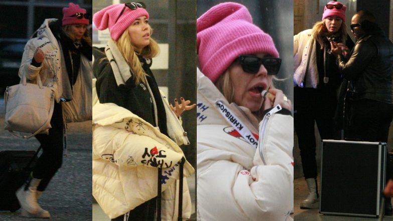 Podczas wyczekiwania na mrozie celebrytka przyodziana w oryginalną zimową stylizację, na którą składały się ciepła kurtka i różowa czapka, zadbała o odpowiednie nawilżenie ust.