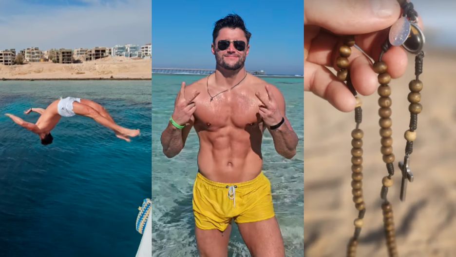 Strzaskany na mahoń Piotr Mróz smaży klatę w Egipcie. Tylko on, osoba, która go nagrywa i... różaniec: "Wszędzie razem"