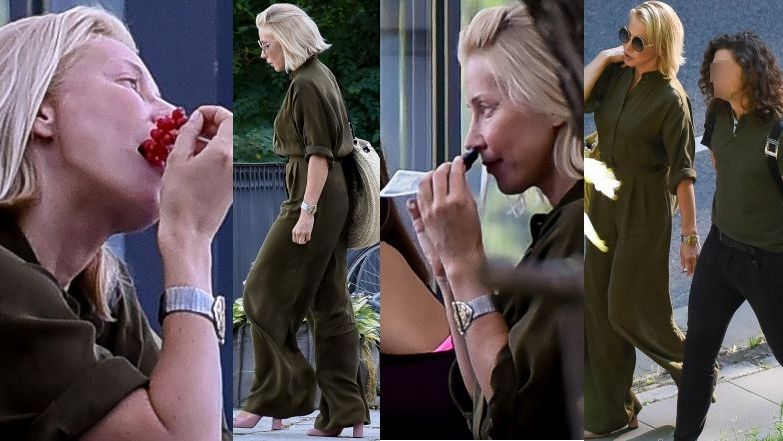 Ostatnio Kasia wyjątkowo wybrała się do jednego ze stołecznych lokali bez męża. 43-latce towarzyszył jednak tajemniczy mężczyzna z burzą loków na głowie. Podczas spotkania Warnke zajadała się owocami i popijała wodę, wpatrując się w swojego towarzysza. Gdy doszło do płacenia za spożyty posiłek, aktorka staranne obwąchała banknoty, które następnie wręczyła kelnerce. Tego dnia ukochana Piotra zaprezentowała się w stylowym ciemnozielonym kombinezonie i butach na obcasie. Stylizację uzupełniła modną w tym sezonie słomianą torebką.