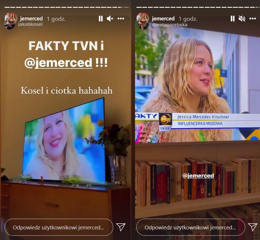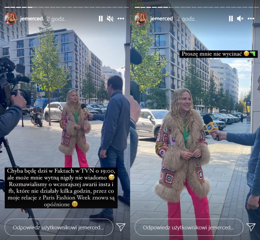 Na Instastories Jess zapowiedziała jednak, że i tak wrzuci te materiały, bo "szkoda contentu". W kolejnych relacjach pochwaliła się też rozmową z dziennikarzem "Faktów" i poprosiła, żeby nie wycinać jej w montażu.