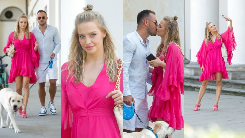 Wystrojona w zwiewną różową sukienkę oraz dopasowane kolorystycznie klapki na obcasie celebrytka przechadzała się ulicami Warszawy, trzymając męża za rękę i doglądając maszerującego na smyczy pieska. Pisarek ochoczo głaskała ukochanego pupila, okazjonalnie karmiła go również ulubionymi przysmakami. 24-latka nie zapominała też rzecz jasna o ukochanym i podczas krótkiego przystanku skradła mu pocałunek.