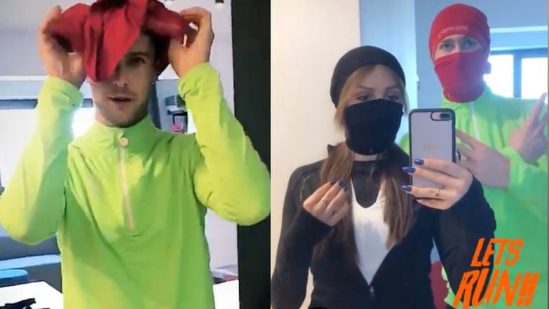 Jesteśmy gotowi na bieganie. W czas kwarantanny nie chcemy nikogo zarazić, więc będziemy biegali z daleka od ludzi, ale nie mamy czegoś takiego jak maseczki. Wszystkie są wykupione, więc robimy to własnym sposobem - zaczął instruktaż Mikołaj.