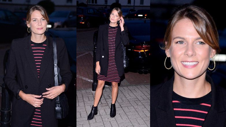 Szczupła Marta Wierzbicka eksponuje długie nogi w pasiastej sukience na premierze spektaklu z Julią Wieniawą (ZDJĘCIA)