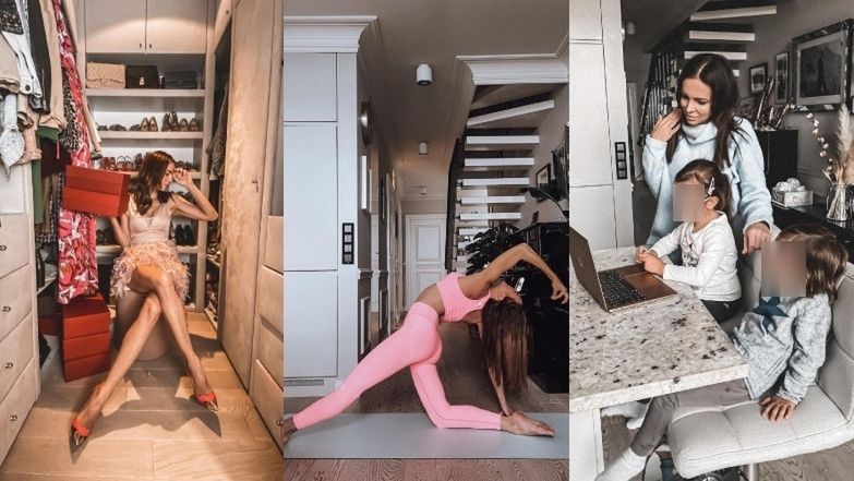 Wendzikowska wykorzystuje całą przestrzeń swojego apartamentu. W korytarzu obok kuchni, prezenterka ćwiczy jogę. Za nią rozciągają się schody na piętro, a ściany zdobią liczne fotografie w czarnych ramkach. W korytarzu znajduje się również stare pianino i szafki, na których stoją liczne stylowe ozdoby, wazony i ramki ze zdjęciami.