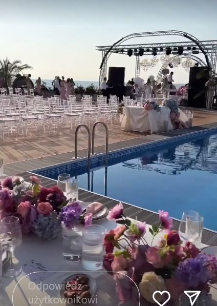 Państwo młodzi zadbali o każdy szczegół oprawy wydarzenia. Miejsce, w którym składali przysięgę, ozdobione było pięknymi kwiatami, które tworzyły romantyczną atmosferę. Stoły, które znajdowały się tuż obok, uginały się pod ciężarem nie tylko wykwintnych potraw, ale również eleganckich dekoracji. Kwiaty, będące motywem przewodnim uroczystości, pływały także w basenie, przy którym później bawił się zgromadzony tłum. Całość dopełniało subtelne oświetlenie.
