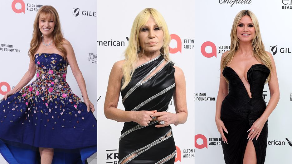 Tłum gwiazd na oscarowej balandze Eltona Johna: poważna Donatella Versace, Heidi Klum w czerni, dziewczęca Jane Seymour