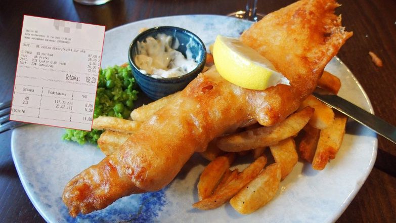 Z analizy paragonu wynika, że jeden zestaw składający się z dorsza podawanego z frytkami i surówką kosztował 29 zł. Halibut był natomiast sprzedawany na wagę - za 0,24 kg tej ryby mężczyzna zapłacił 25,20 zł. Dodatkowa porcja frytek kosztowała 8 zł. Do obiadu zamówiono również lemoniadę, za którą trzeba było zapłacić 12 zł, a za duże piwo mężczyzna zapłacił 10 zł. W sumie obiad dla czterech osób wyniósł 152,20 zł.