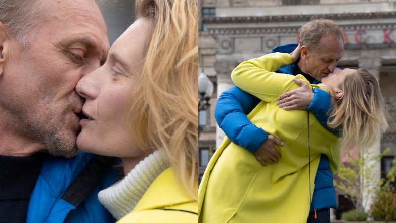 Ubrani w barwy Ukrainy Andrzej Chyra i Agata Buzek NAMIĘTNIE CAŁUJĄ SIĘ przed Pałacem Kultury (ZDJĘCIA)