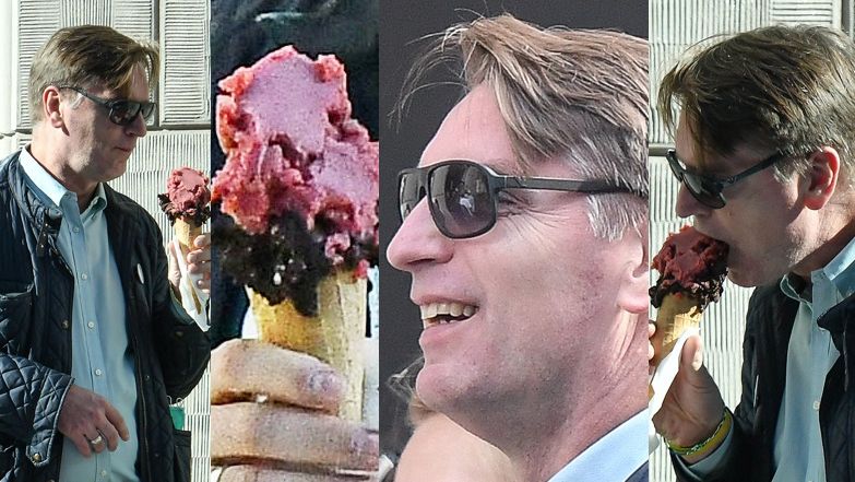 Dziennikarz pozwolił sobie na chwilę beztroski pod budką z lodami.
