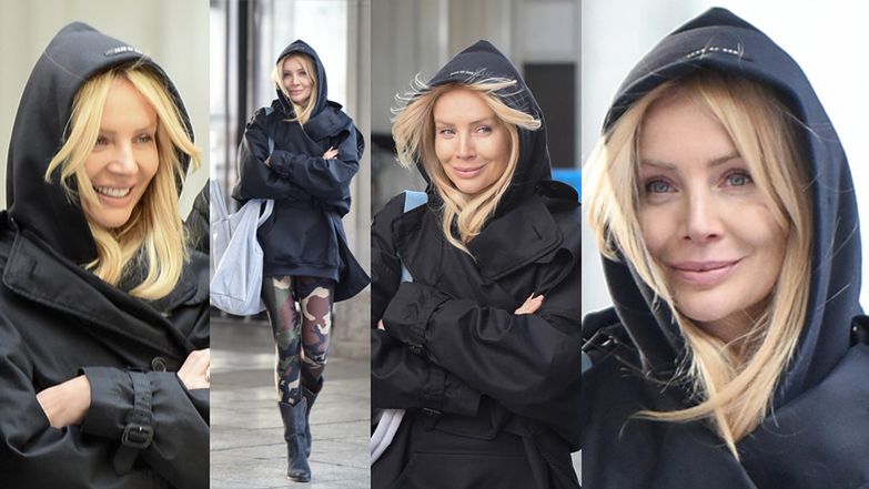 Dziennikarka wyglądała na zadowoloną. Ubrana była w legginsy z motywem moro, zamszowe kowbojki i obszerną kurtkę z kapturem. Stylizację uzupełniła wielką, białą torbą.