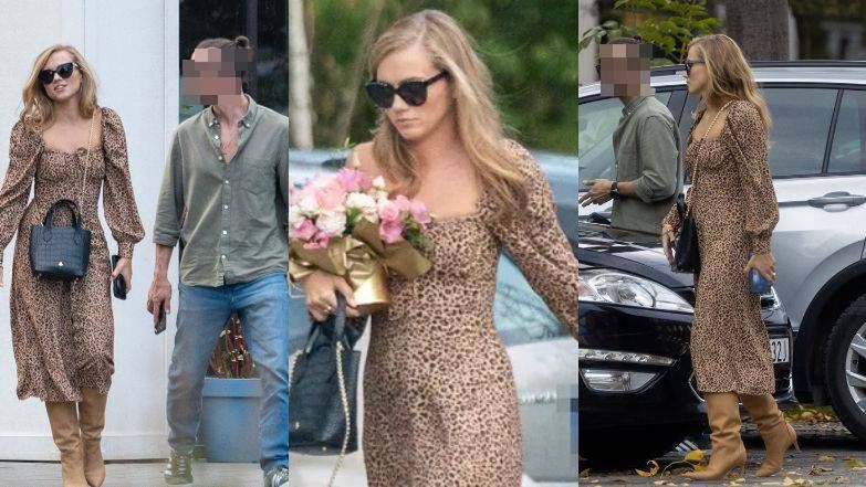 Była ukochana Macieja Peli tego dnia postawiła na jesienną stylówkę składającą się z zamszowych butów na obcasie oraz sukienki w panterkę. Do tego dobrała czarną torebkę na łańcuszku.