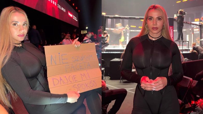 Nie szukam faceta. Dajcie mi spokój - czytamy na kartonie, z którym na gali Fame MMA pozowała Marianna.
