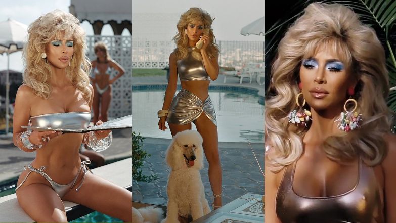 Nowa kampania Kim zrealizowana została na terenie luksusowej willi, a większość ujęć powstała nad basenem. Celebrytka dołożyła wszelkich starań, by na zdjęciach jak najlepiej oddać klimat lat 80. Podczas sesji wystąpiła więc wystylizowana w duchu wspomnianej epoki. 41-latka zaprezentowała się w charakterystycznych dla tamtych czasów gigantycznych, natapirowanych lokach. Postawiła również na odpowiednio krzykliwy makijaż - powieki podkreśliła błękitnym cieniem, na obrysowane konturówką nałożyła zaś grubą warstwę błyszczyka.