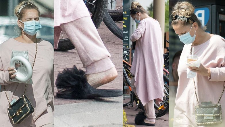 Liszowska postawiła na wygodę, wybierając na tę okazję luźny różowy komplet i czarne tiulowe klapki. Stylowa?