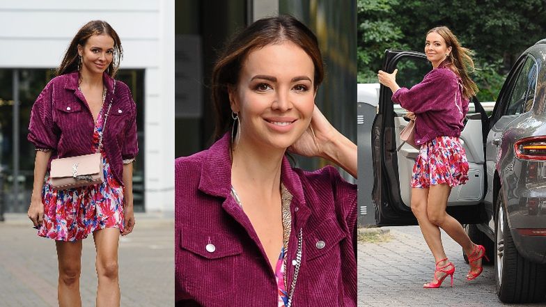 Nie jest tajemnicą, że Ania stara się śledzić modowe trendy. Tego dnia dziennikarka postawiła na kwiecista sukienkę Just Paul, na którą narzuciła fioletową, sztruksową kurtkę.