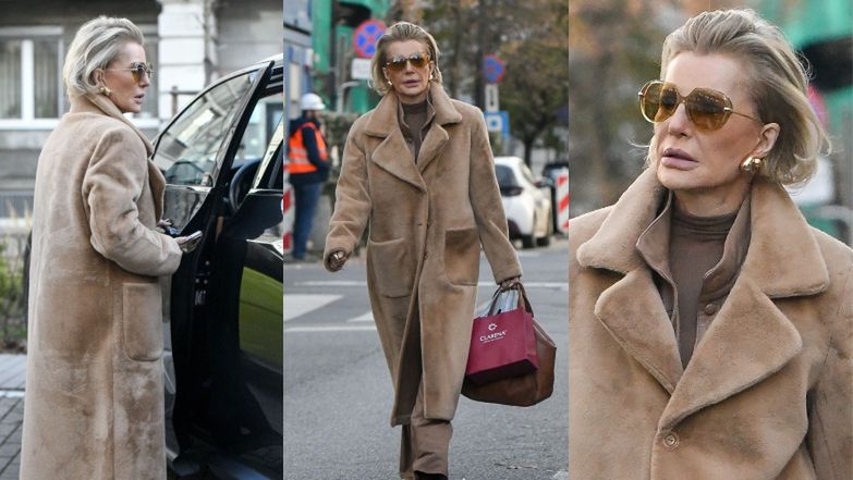 Joanna Racewicz tego dnia postawiła na długi futrzany płaszcz i zbliżone kolorystycznie spodnie w ciemniejszym odcieniu beżu. Jej jesienną stylizację wzbogaciły złote dodatki w postaci kolczyków i sporego rozmiaru pierścionka. Ponadto postanowiła ukryć twarz za okularami przeciwsłonecznymi, które z oczywistych względów pełniły jedynie funkcję ozdobną.