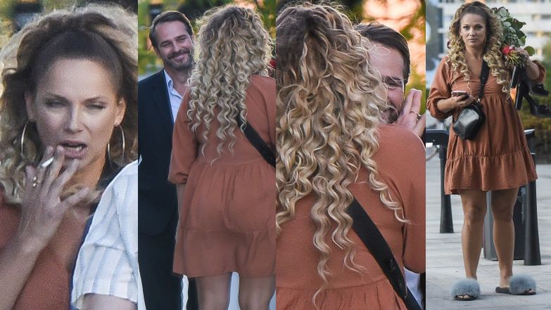Na wykonanych przez paparazzi zdjęciach widzimy, jak podczas przerwy od ujęć wystylizowana Liszowska zaciąga się papierosem. Zaraz potem 42-latka serdecznie przywitała się z serialowym eksmężem, którego uraczyła całusem prosto w usta.