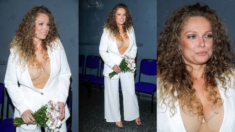 Wyzwolona Joanna Liszowska w białym garniturze eksponuje cielisty stanik. Udana stylizacja? (ZDJĘCIA)