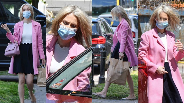 Na zakupach prezenterka mogła liczyć na towarzystwo skrytego pod maską pana w beżu. Pasował kolorystycznie do pudroworóżowej stylizacji Ogórek?