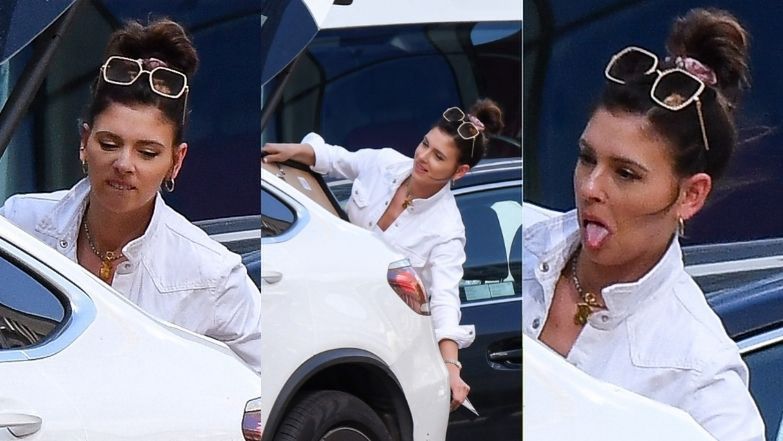 Zobaczcie, jak Klaudia Halejcio prezentuje bogatą mimikę twarzy, pakując obraz do bagażnika.